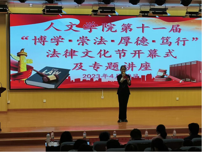 为响应学校“一院一品”的要求,发挥我院专业特色,体现我院学生精神风貌,提高我院学生的专业知识水平和技能,增强同学们的社会责任感,人文学院于4月10日15:00在图书馆报告厅举办了第十一届“博学•崇法•厚德•笃行”法律文化节开幕式及专题讲座。参与此次开幕式的嘉宾领导有,人文学院分党委书记计毅波,副院长成继平,法学系主任郑实,学工办主任向平及全体班主任、辅导员,和其他学院的学生会代表。