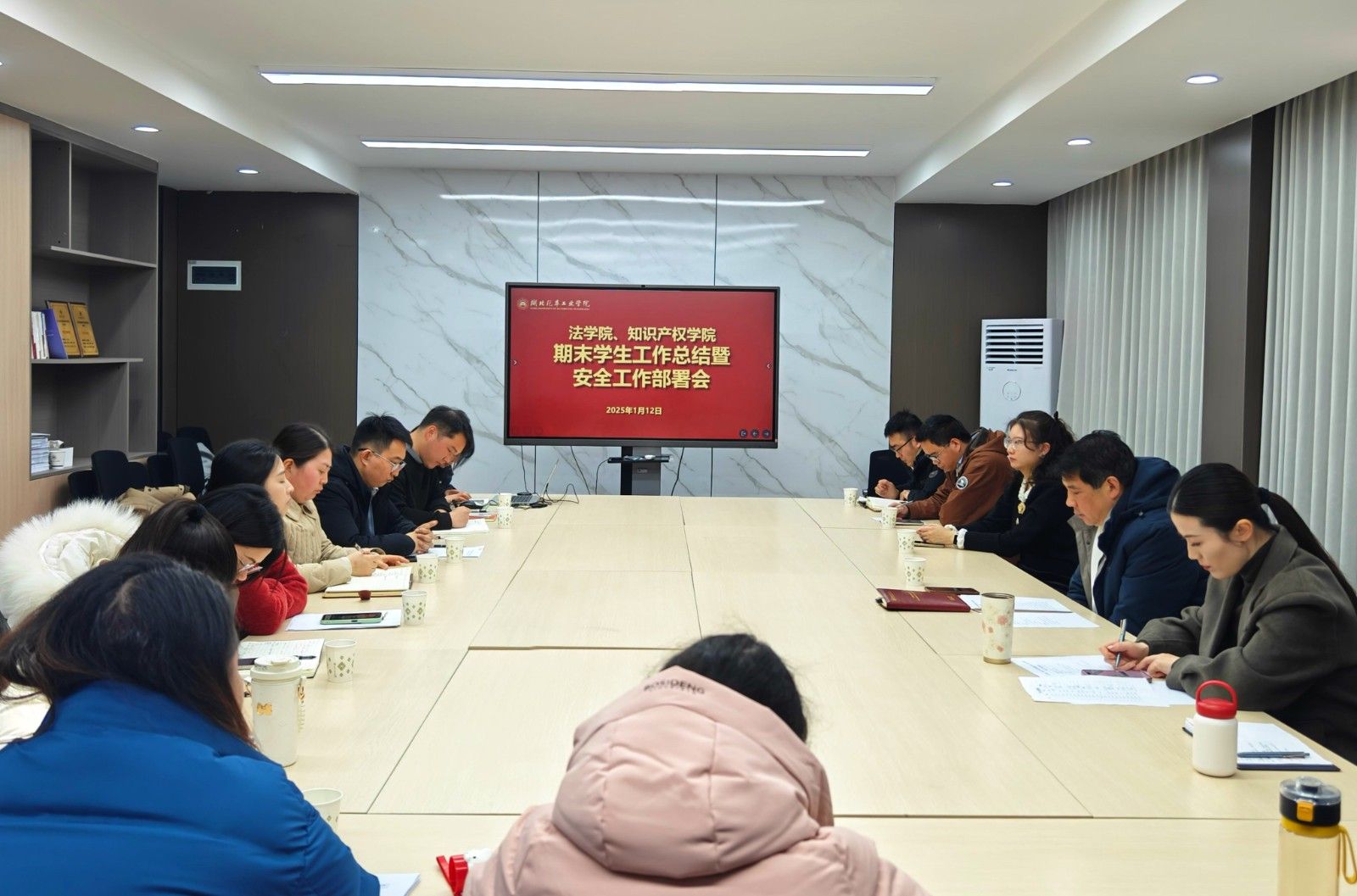 会上郭慧通报了本学期各班学生情况及相关数据,李童聚焦近期安全工作与下学期初的工作安排,提出明确要求,特别强调毕业生班需在假期前实现就业数据清零,确保就业工作有序推进。